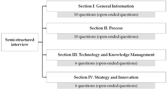 As to interviews, a semi-structured protocol composed of 32 open-ended questions was developed to have standard, but flexible guidelines during the interviews. The protocol encompassed four sections (Figure 3), namely General Information, Process, Technology and Knowledge Management, Strategy, and Innovation. Questions reported in the “Section 1” were aimed at better understanding the mission, and the organizational structure (e.g., age, role, and sector of employees). The “Section 2” asked questions useful to understand processes carried out and workflows, information and document flows, and interactions with other actors operating in the same or different organizations (e.g., description of the activities in which the officers are involved, duration of each activity, and interconnection among sectors). The questions, repeated for each process, were formulated based on the Input-Guides-Outputs-Enablers method [56]. The “Section 3” investigated the role of technologies and the modes adopted to manage explicit and tacit knowledge [57] (e.g., external stakeholders involved in processes and interaction modes, technologies and information systems used, and knowledge exchange, mode). The “Section 4” explored the actors’ point of view on strategies and innovation opportunities for the Agencies (e.g., willingness to adopt new technological solutions, priorities and barriers to innovation). Such data were extremely useful for exploring innovation opportunities according to the ambidextrous BPM approach [23].