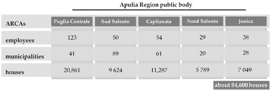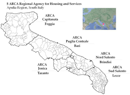 The multiple case study encompassed the five Regional Agency for Housing and Services (ARCA—Agenzie per la Casa e per l’Abitare) located in the Apulia Region, namely: ARCA Puglia Centrale for Bari Metropolitan city, ARCA Sud Salento for the province of Lecce, ARCA Capitanata for the province of Foggia, ARCA Nord Salento for the province of Brindisi, and ARCA Jonica for the province of Taranto (Figure 4).