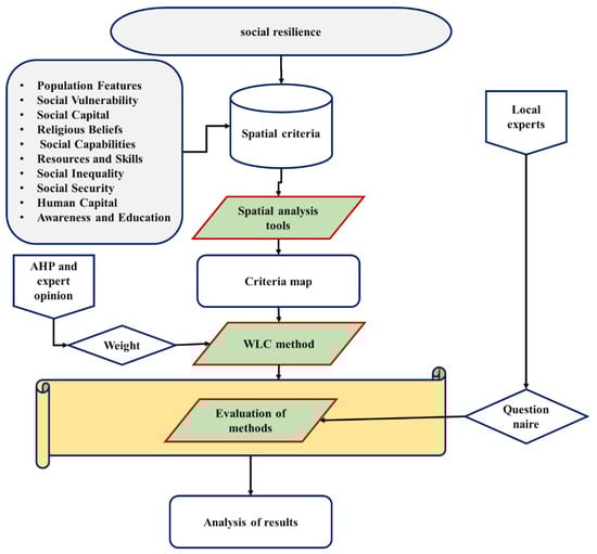 In Figure 2, the overall flowchart of the proposed methodology is illustrated. In the first step of this proposed approach, the effective social resilience variables were selected and standardized with reference to theoretical literature and previous studies. In the second step, the criteria were weighted based on experts’ opinions and an Analytical Hierarchy Processes [28] method. In the third step, using the suggested GIS-MCDM approach and the map of criteria and the resulted weights, the final social resilience map of the target region was prepared. At the end, in the fourth step, the obtained results were assessed.