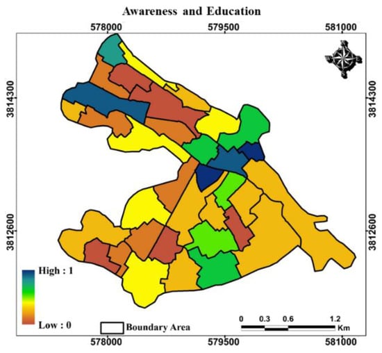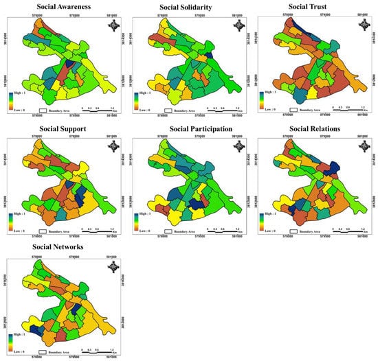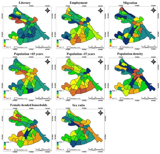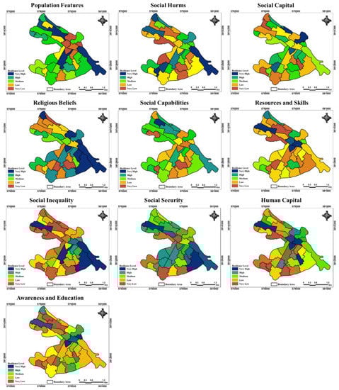 According to the values of the standardized criteria and criteria weights, the decision-making analysis method could be used to create a set of social resilience maps, based on the WLC method. Social resilience maps are prepared on the basis that the weights of the criteria are different for all variables. The values of variables range from 0 to 1. Values of 0 indicate very low resilience and values of 1 indicate very high resilience. The maps of variables were categorized into 5 categories, based on the degree of social resilience: very low (0–0.2), low (0.2–0.4), medium (0.4–0.6), high (0.6–0.8) and very high (0.8–1).