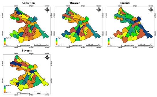 The statuses regarding the criteria related to the social harms index are shown in Figure 4, and indicate that, from this regard, Sarpol-e Zahab was not in a good condition. As can be clearly seen, the suicide criterion had a high locative variance throughout the city compared to other criteria; specifically, the southern and southwestern areas were not in good condition, while the northwestern regions were in a better state than the others. Regarding addiction and poverty, in most parts conditions were not suitable.