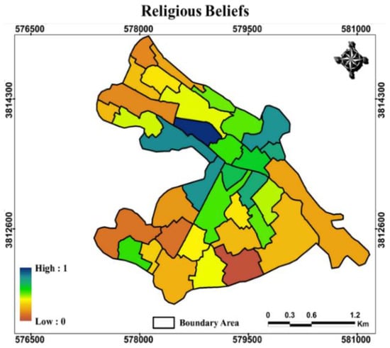 Figure 6 depicts the status of the religious beliefs index as a significant factor affecting social resilience against various hazards. As is clear from the maps, in this regard, a specific locative pattern was observable throughout the urban areas; the northwestern parts, that are mainly populated by Sunnis, were in an unsuitable state. The central regions, the population of which mostly believe in the Yarsan religion, were in a relatively good state. Additionally, the southeastern parts were in a suitable status, while the southern areas were in unsuitable conditions.