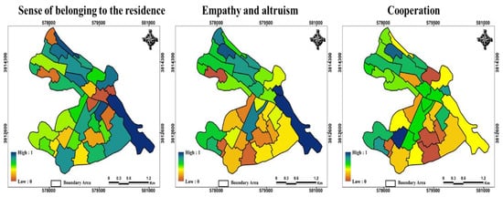 According to the findings depicted in Figure 7, showing the status of the local community capability index, it is observable that there was a certain locative diversity among urban areas in all the criteria. The sense of belonging to place was relatively low in the central areas, medium in the southern areas, high in the southeastern areas, and relatively high in the northwestern areas of the city. Besides this, the sense of empathy and altruism were low in the southern areas, moderate in the northwestern areas, and high in parts of the southeastern areas.