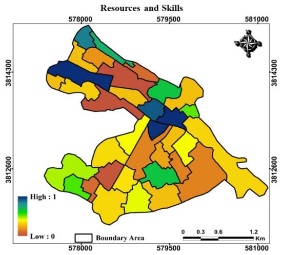 The results illustrated in Figure 8 show that in terms of the resources and skills index status, except for some areas in the center and northwest, most other urban areas were not in good conditions. As is observable, in this regard, the southern and suburban areas of the city were in unacceptable conditions, and centralization of resources in the central part of the city was higher than in other areas.