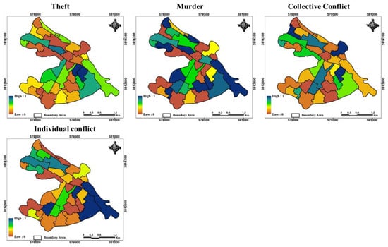 The findings depicted in Figure 10 show that there is great locative diversity between urban areas in terms of the social security index criterion in Sarpol-e Zahab. As is clear, the murder rate was high in southern and central areas, low in southeastern areas and moderate in northwestern areas. Also, the rate of theft was very high in the southern and central areas of the city, and moderate in the southeastern areas.