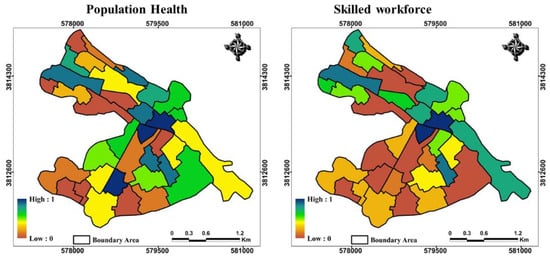 According to the results shown in Figure 11, that are indicative of the conditions of the human assets index criterion, it is clearly observable that, considering population health, there was locative diversity throughout the city. Southern parts were not in good conditions, central regions were in good conditions, southeastern areas were in moderate conditions and northwestern parts were in relatively good conditions. On the other hand, considering the criterion of a trained and skilled workforce, most of the urban areas were not in good conditions.