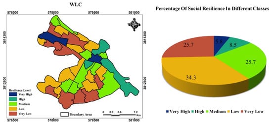 In Figure 14, the final map of social resilience obtained from the WLC model, based on GIS-MCDM and the diagram of the percentage of social resilience in the urban areas in different classes, is presented. The results indicated that the levels and scope of social resilience were not evenly distributed throughout the city. Almost all areas in the south and southwest were in poor social resilience conditions. The central and eastern areas had better conditions, in terms of social resilience, compared to other districts and urban areas.