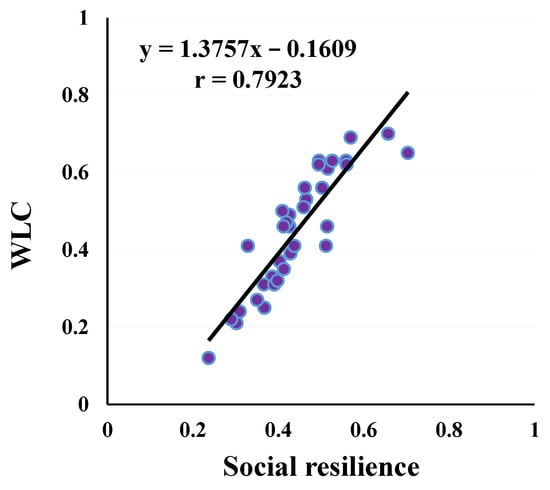 Correlation coefficient between the results of WLC model and real-world social resilience data.