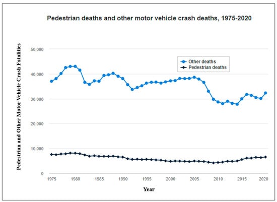 Pedestrian deaths and other motor vehicle crash deaths (1975–2020) (adapted from []).