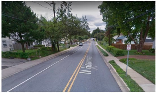PLOC partial scores are retrieved from matrices developed by the FHWA according to the roadway conditions as a function of roadway speed, number of lanes with sidewalks, bicycle lanes, parking, and planting buffers. A PLOC scoring example is presented in a report titled, “Pedestrian Level of Comfort Methodology,” prepared by the Montgomery County Planning Department as part of the Montgomery County’s Pedestrian Plan in 2020. The example corresponds to a road segment located on 408 North Horners Lane, Rockville, MD, USA []. Figure 3 shows the characteristics of the roadway section and conditions to calculate PLOC, which are summarized as follows: