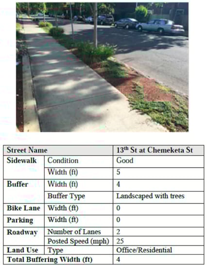 PLTS partial scores are retrieved from matrices developed by the FHWA according to the roadway characteristics and evaluation criteria as a function of sidewalk condition, physical buffer type, total buffering width, general land use, collector and local un-signalized intersection crossing, and arterial un-signalized intersection crossing, with or without a median refuge. An example for a road segment located on 13th St at Chemeketa St, Salem, OR, USA, is presented in the manual titled, “Analysis Procedures Manual-Version 2,” published by the Planning Section Transportation Planning Analysis Unit of the Oregon Department of Transportation (ODOT) in 2018 [].