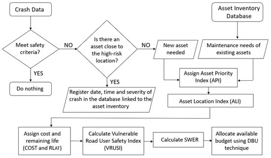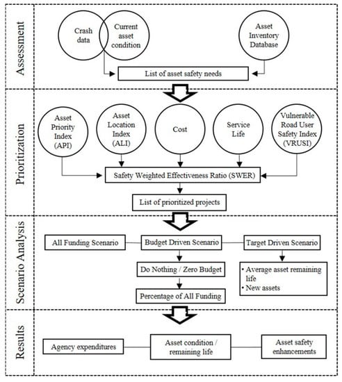 Transportation asset management (TAM) is “a strategic and systematic process of operating, maintaining, upgrading, and expanding physical assets throughout their lifecycle” []. TAM involves a complex decision-making process to preserve transport infrastructure in a “state of good repair” in the most cost-effective manner. Traditionally, performance measures related to physical infrastructure conditions are used by infrastructure management systems to recommend candidate projects for funding allocation, although safety factors are not integrated into the prioritization criteria. For this reason, there is a need to incorporate safety criteria, with tangible metrics, into TAM practices. The motivation of this paper is to improve safety for all users by the development of a comprehensive methodology that integrates safety criteria into TAM.