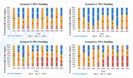 Figure 7 illustrates the consequences of limited funding on the crosswalk’s remaining life. In the budget-driven scenarios, the remaining life of all the crosswalks is between 1 and 2 years at the beginning of the analysis, or year of operation (YO). In the budget-driven scenario 3 (85% of funding), up to 13% of crosswalks have no remaining life, and only 83% of new crosswalks are implemented. In scenario 4 (70% of funding), up to 13% of crosswalks have no remaining life, and only 67% of new crosswalks are implemented. With more limited budgets in scenarios 5 and 6 (50% and 35% of funding), up to 43% and 50% of crosswalks, respectively, have no remaining life, and only 50% and 33% of new crosswalks, respectively, are funded.