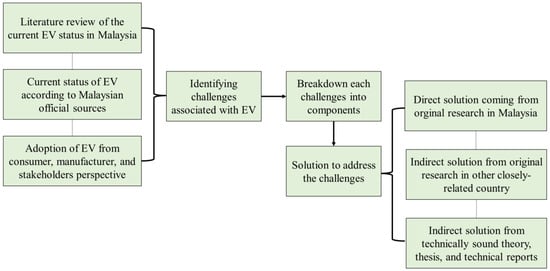 This study focused on the challenges of EV culture implementation in Malaysia and the possible solutions to address each challenge. The entire research comprises selected data collected from the literature, Malaysian official reports, and company data regarding EV deployment and adoption, as well as suggested required changes in operation, manufacturing, and policy to boost the mass utilization of EVs in the Malaysian context. While selecting the related literature, the authors have considered the following strategy. First, the key challenges to the vast EV growth throughout Malaysia are summarized. Second, each challenge is picked up and broken down into components/factors that are the crucial points to address/solve the challenge. After that, relevant literature is searched and located to comprehensively analyze those points and provide feasible solutions for the Malaysian economy. If no relevant literature was located from a Malaysian perspective, the focus is shifted onto articles that showed significance and addressed the similar challenge in other countries economies and socio-cultures closely matched with Malaysia, such as South Korea, Singapore, China, and Japan. If no work is located on the issue at hand, theoretically sound company data, original thesis works, and secondary implementation of current technology are considered that could provide a potential solution to the challenges and pave the way for further original research to address the issue. Finally, the authors have asked diverse questions about EV planning, policies, prospects, and customer satisfaction to local manufacturing companies and researchers. The study framework is summarized in the flow diagram shown in Figure 1.