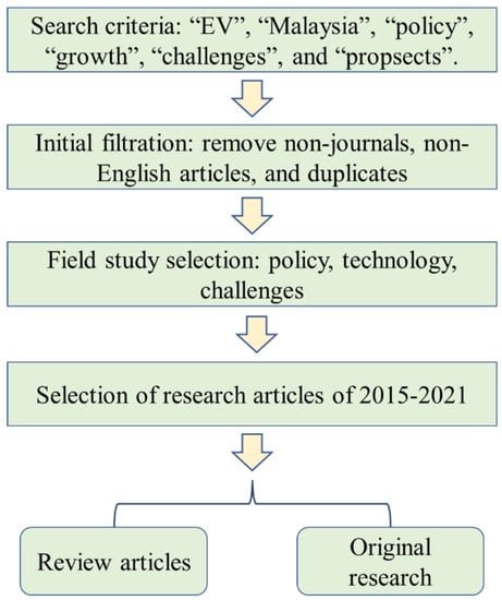 This study considered a structured way to review the current literature and summarize the prospects, challenges, and possible solutions to vast EV adoption throughout Malaysia. First, a relevant literature pool is created from the search results of keywords comprising “EV”, “Malaysia”, “policy”, “growth”, “challenges”, and “prospects”. Table 1 demonstrates the key research works regarding EVs from a Malaysian perspective. The modeled pool of original and review articles is filtered and narrowed between 2015 and 2020. The original articles are sorted into the specific issues/challenges they tried to address related to the EV manufacturing process, battery management, EV infrastructure in Malaysia, government policy for EV in Malaysia, and inclination towards EV culture from consumer and stakeholders perspectives. The process considered here closely matches with ref. [] and is shown in Figure 2.