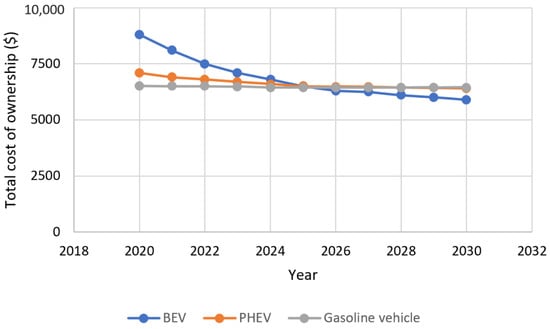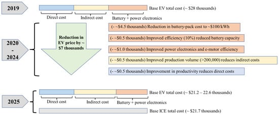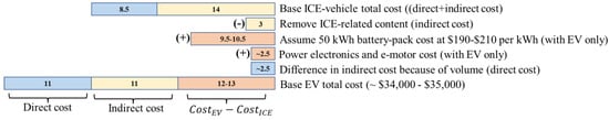 Furthermore, the battery cost is another single contributor to the price difference. It is reported that the Nissan Leaf and BMWi3s have higher manufacturing recommended sales price (MSRP) compared to the Ionia HEV Plus, Jazz 1.5 Hybrid, and Perodua Myvi 1.5. High AT, as the price of components to build an EV is very high during the manufacturing process compared to the operation and disposal stage []. The direct and indirect costs of the CV and EV are often considered to impact the average price per vehicle manufactured (Figure 5) [].