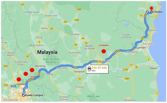 Table 5 summarizes EV battery capacities and ranges for EVs inside and outside the Malaysian border. According to the table, the range of the travel distance depends on the battery capacity. Higher battery capacity results in longer distances. Thus, to travel from Kuala Lumpur to Chukai, Terengganu, the Mitsubishi iMiev, MINI Cooper SE, BMW i3s, and Nissan Leaf need to recharge halfway as the distance to be traveled is 297 km (Figure 6). However, there is no charging station in Chukai, and only a few charging stations are currently located along the Lebuhraya Pantai Timur (LPT). This is a problem for small battery capacity vehicles. In addition, it will increase the driver’s anxiety about being stranded on the road without a battery charged sufficiently to reach the destination.