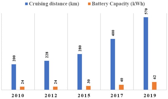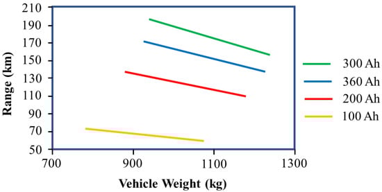 A few research studies conducted in 2016 have concluded that a bigger battery capacity results in a heavier battery weight (Figure 7); thus, it affects the vehicle weight and eventually reduces the range of the electric vehicle [,,]. As a result, in Table 5, the battery manufacturer must develop lightweight batteries with high energy density to make a more extended range of travel possible. This will decrease the hesitancy of people to own an electric car.