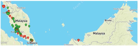The lack of availability of charging stations along the driving path is another core issue for EV users. Charging stations in most countries are concentrated around a specific neighborhood, which creates a dilemma for the users as to when and where to get served []. For example, as reported by the Malaysian Automotive Association (MAA), Malaysia currently has 4000 EV charging stations which are primarily distributed in big cities on the western side of Malaysia; Kuala Lumpur, Selangor, Pulau Pinang, and Johor Yusof [], as shown in Figure 8 [,] and not widely available in the east and east coast of Malaysia.