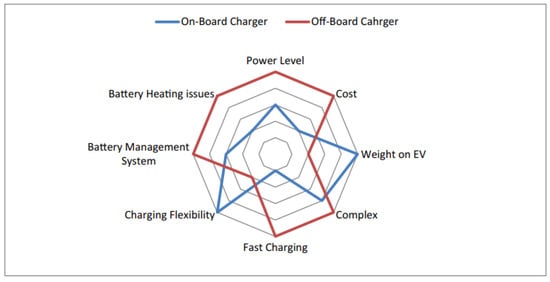 The charging time also varies according to the level of the chargers (Level 1 to Level 4). Level 1 corresponds to the built-in charger in most EVs using household power sockets and does not require additional circuitry. It is found that the charging of a 24 kWh Nissan Leaf using a Level 1 1.4 kW residential outlet will need nearly 17 h to charge the battery fully []. Level 2 chargers are three-phase chargers that can charge the EV to full capacity in approximately 7 to 9 h. For example, a Level 2 charger (6.6 kW) requires 7 h to fully charge the battery of a Nissan Leaf []. Level 3 and Level 4 chargers use advanced DC charging techniques to charge the EV battery directly. These superchargers can charge 80% of the battery in 15 to 20 min []. However, charging with superchargers more than two times a day is not advisable to preserve improved battery life. Thus, charging an EV battery using a normal charger will be much more time-consuming unless the EV owner has Level 3 or 4 chargers or lives near the spots that provide superchargers. Moreover, the charging is no longer attractive and feasible for an EV housed with a 70–100 kWh battery []. For instance, it will take 50 h to charge a 70 kWh battery of a Tesla car if a normal wall outlet is considered, and 11 h using a 6.6 kW outlet [].