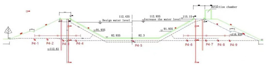In this paper, the osmotic pressure data of high-filled (SH(3)124+525, SH(3)124+953.5, SH(3)125+053.5, SH(3)125+453.5) water diversion projects are taken as an example to establish an osmotic safety evaluation model. Some of the engineering data of SH(3)124+525 were as follows: the elevation of the bottom of the channel was 82.935 m, the design water level was 112.435 m, the elevation of the osmotic pressure value was approximately 82.3 m, the inner slope ratio of the channel was 1:2, and the outer slope ratio was 1:2~1:2.5. Based on channel safety monitoring, a more comprehensive channel prototype monitoring system was deployed in this channel section; this monitoring system consisted of deformation monitoring, osmotic monitoring, and environmental quantity monitoring (e.g., rainfall or reservoir water level monitoring) and other items; osmotic monitoring adopted a buried installation osmotic pressure value, as shown in Figure 1. The measuring points numbered from left to right were P4-1~P4-9, for a total of 9 measuring points, of which P4-1~P4-4 and P4-6~P4-9 were arranged in the high-filled area on both sides. Inside, P4-5 was arranged at the bottom of the channel, and the data collection time interval was 3~15 d.