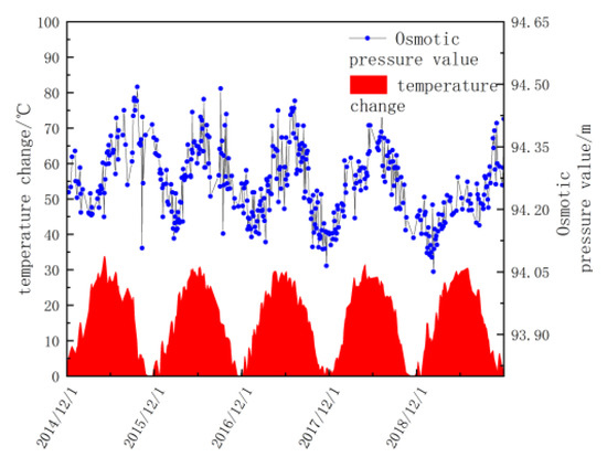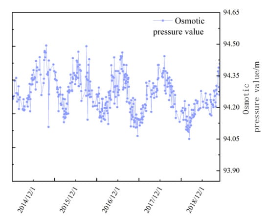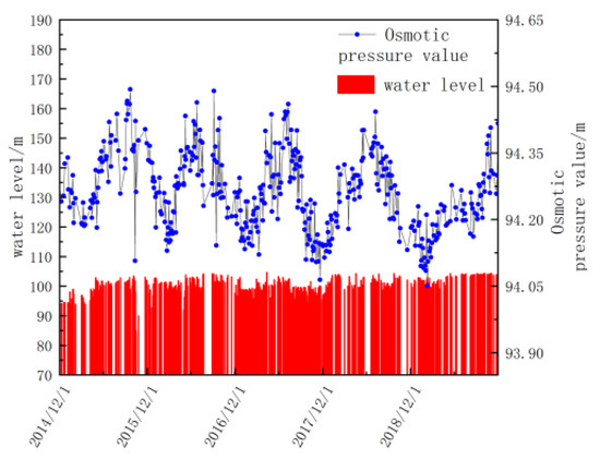 Taking the osmotic pressure value P4-6 as an example, the data changes in the past five years from 2014 to 2018 are shown in Figure 2. This figure shows that the actual measured osmotic pressure fluctuated in a relatively stable range and changed due to changes in water level, temperature, and other factors. The monitoring results were basically reasonable. During the monitoring period, the interannual temperature changes were relatively stable with a large range of changes during the year; e.g., the highest temperature was approximately 38.70 °C and the lowest temperature was approximately −10.40 °C. During the monitoring period, the water level in the channel changed little, and the water level data varied from 87.13 m to 112.17 m. Compared with the periodic change characteristics of temperature, the change in the osmotic pressure value was relatively gentle and obviously lagged behind the influence of the osmotic pressure level at the front (see Figure 3 and Figure 4). The above description shows that the measured osmotic pressure clearly correlated with the water level and temperature changes in the channel.