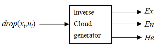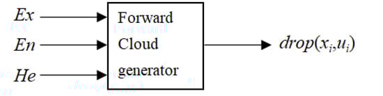 A cloud generator is a specific algorithm for mutual conversion between qualitative concepts and quantitative data in a cloud model. The forward cloud generator realizes the conversion from a qualitative concept to a quantitative value, and cloud drops are generated from the digital characteristics of the cloud , as shown in Figure 6. The reverse cloud generator realizes the conversion from a quantitative value to a qualitative concept. The generator converts accurate data into a qualitative concept represented by cloud digital features , as shown in Figure 7. The specific algorithm is as follows: