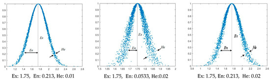 The existence of hyper-entropy makes the cloud model distribution exist in two states. When the value of is small, cloud drop b assumes a pan-normal distribution. In extreme cases, that is, when the value of is 0, the discrete cloud drops outline the shape of a normal distribution. With the continuous increase in , the distribution of cloud drops enters a state of obvious fogging: the expected curve of the cloud is no longer obvious, the outer cloud drops are more scattered, and the core cloud drops have a clear centralization trend (Figure 8). According to relevant studies [25,26,27], the state of the cloud model is demarcated at ; that is, when , the cloud drop shows a pan-normal state; otherwise, the cloud drops are in an atomized state.