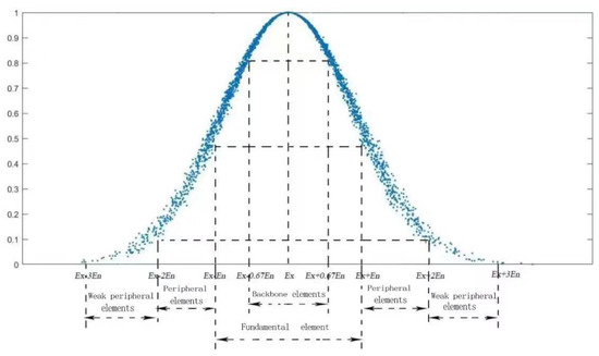 Therefore, according to the distribution of cloud drops, the cloud model theory proposes the “3 rule” for cloud drops under a normal distribution (Figure 9); that is, for the universe of U, the quantitative value that contributes to the qualitative concept falls mainly within the range of , and the contribution of the data in this interval to the qualitative concept accounts for approximately 99.74% of the total data. The elements in the interval , the intervals and , and the intervals and each account for 33.33% of the total elements, but these elements are qualitative. The contribution of the concept is 68.26%, 27.18%, and 4.3%, respectively. When the cloud drop distribution is in an atomized state, the cloud drop distribution is also characterized by central clustering or local cloud droplets gathering into clusters, but it is impossible to determine the contribution of specific data to the qualitative concept.
