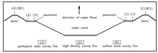 In terms of inspection information verification, nondestructive inspection methods, namely, geological radar, high-density electrical methods, and surface wave methods, were used mainly to realize the internal abnormality judgment of the channel. The ground-penetrating radar method was aimed mainly at detecting the soil within 10 m of the channel section, while the high-density electrical method and the surface wave method were aimed mainly at detecting the depth of 5–30 m. Therefore, combining the above three methods can realize the characteristic analysis of the spatial distribution of the soil information caused by channel seepage by using tomography to determine whether, based on the figure information and data, there are potential safety hazards in the channel section and combining tomography with the analysis results of the monitoring dataset to realize mutual verification.