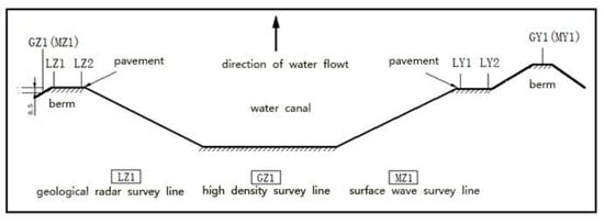 The working configuration was determined according to the site conditions. The geological radar was generally arranged on the road surface on both sides of the channel, facing the downstream direction, from the left bank to the right bank. The high-density electrical method was furnished at the unhardened position of the embankment toe or the top of the embankment on the outside of the road surface, and the survey line numbers were GZ1 and GY1 in turn; the surface wave method was the same as the high-density electrical method. The line numbers were MZ1 and MY1 in sequence. The layout diagram can be seen Figure 11 and Figure 12.