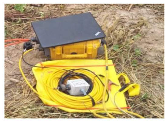 The ground-penetrating radar adopted the SIR-3000 ground-penetrating radar produced by GSSI Company in the United States and adopted a 100 Mz shielded antenna. The high-density electrical method employed the WDJD-3 multifunctional digital DC IP instrument of Chongqing Pentium, as shown in the Figure 13, with multiple high-density cables and special copper electrodes; the surface wave exploration used the Geode-24 engineering seismograph produced in the United States, as shown in the Figure 14. A 26-pound sledgehammer was used as the source, a 4.0 Hz vertical detector was used to receive the signal, and the 2 m and 5 m track spacing detector cables were in employment.