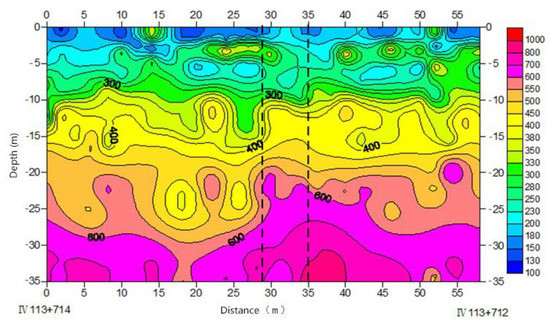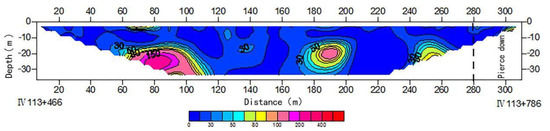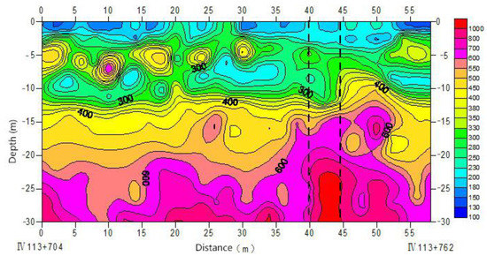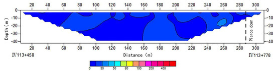 Survey line GZ1: the resistivity profile (Figure 19) shows that the overall resistivity was low and uniform, and the resistivity was basically below 40 Ω·m, thus indicating that the underground soil quality was relatively uniform and that there were no obvious defects in the detection range. Survey line GY1: the resistivity profile (Figure 20) shows that most of the resistivity was below 40 Ω·m. When the horizontal distance was 60~110 m, the depth was 15~33 m; when the horizontal distance was 180~200 m, the depth was 12~28 m; and when the horizontal distance was 245~260 m, the depth was less than 20 m. The area had a relatively high resistance and the resistivity exceeded 50 Ω·m, thereby indicating that the existence of high underground resistance was abnormal. The horizontal distance was 180~200 m and the depth was 12~28 m. The area was a closed high-resistance area and may have been a gravel area. It was recommended to check regularly later; according to the overall profile, the high resistance of the other two parts should have been caused by changes in the soil quality, and the possibility of defects was small. In general, the two measuring lines had no obvious abnormalities near the underpass project, and the possibility of defects was small.