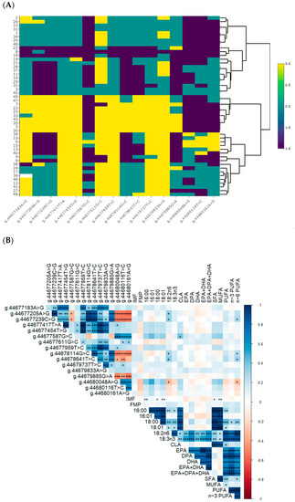 alternative allele homozygotes. (B) Correlations between SNP and IMF, FMP and fatty acids. * p < 0.05, ** p < 0.01, and *** p < 0.001.