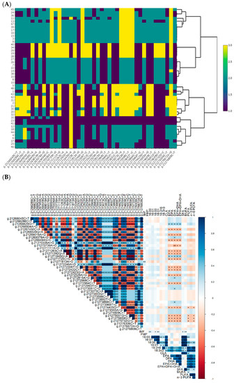 The clustering patterns of the SNP loci among steers with regard to the FABP4, SCD, and FASN genes are presented in Figure 1A, Figure 2A and Figure 3A, respectively. There was less variability in heterozygosity and homozygosity of closely related individuals for the FASN gene SNP compared to the FABP4 and SCD genes. Most SNP were in linkage disequilibrium but a few SNP depicted no linkage (Figure 1B, Figure 2B and Figure 3B). Four FABP4 gene SNP–g.44677205A>G (rs109388335), g.44677239C>G (rs110383592), g.44678114G>C (novel), and g.44678641T>C (rs110490217) were positively correlated with linoleic acid (C18:2n6). One SNP (g.44680048A>G; rs468994137) on the other hand, was negatively correlated with linoleic acid concentration, while g.44677587G>C (rs723716479) was positively correlated with conjugated linoleic acid (CLA) (Figure 1B; p < 0.05). Fourteen SCD SNP were negatively correlated, while g.21266629G>T (novel) and g.21271645G>A (rs380628677) were positively correlated with eicosapentaenoic acid (EPA), docosapentaenoic acid (DPA), docosahexaenoic acid (DHA) (Figure 1B; p < 0.05). No correlation was observed between FABP4 and SCD SNP with IMF, FMP, SFA, or MUFA. In contrast, FASN g.50784242C>T (rs800844468) SNP was positively correlated with IMF, palmitic acid (16:0), oleic acid (18:1), SFA, and MUFA (Figure 3B; p < 0.05). CLA concentration was negatively correlated with g.50787886A>G (novel), g.50788691T>C (rs526036338), and g.50788956C>T (novel) while g.50792445C>T (novel) was negatively correlated with EPA and the sum of EPA and DHA (p < 0.05). Several fatty acids were positively correlated (p < 0.05), and no significant negative correlations between quantified fatty acids were observed. Highly positive correlations (≥0.7) between palmitic acid, palmitoleic acid, stearic acid, and oleic acid with the CLA, SFA, and MUFA levels were observed (p < 0.01).