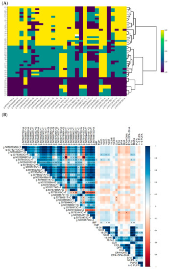 Single nucleotide polymorphisms on the FASN gene. (A) Clustering map of genetic variants;