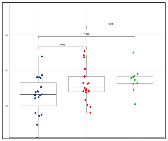 Associations between FABP4 g.44677239C>G (rs110383592), SCD g.21266629G>T (novel), and FASN g.50783803G>A (novel) are presented in Table 2. No significant associations were observed between the FASN g.50783803G>A with IMF, FMP, or any fatty acid examined. However, FABP4 g.44677239C>G was significantly associated with linoleic acid (p = 0.03). Linoleic acid was lower for the CC than the GG genotypes at 45.8 ± 10.88 mg/100 g and 54.5 ± 7.3 mg/100 g, respectively (p = 0.02), but CG was not significantly different from the homozygotes (Figure 4). Significant associations between the SCD g.21266629G>T SNP with DPA, DHA, EPA+DHA, and EPA+DPA+DHA were observed (p ≤ 0.02). Multiple comparisons in Figure 5 indicate that EPA, DPA, and DHA were significantly higher for the TT compared to the GG genotypes (p ≤ 0.03). The DHA level was lower (p = 0.02) while EPA and DPA tended to be lower for the TT compared to the GT variants (p ≤ 0.08). No significant difference was observed for EPA, DPA, and DHA in GT compared to GG variants (p ≥ 0.47). The IMF and FMP levels were not associated with either FABP4 g.44677239C>G, SCD g.21266629G>T, or FASN g.50783803G>A (p ≥ 0.38).