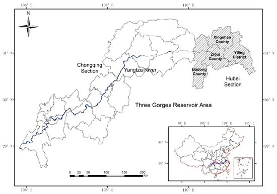 The study area of the Hubei section of the Three Gorges Reservoir Area (self-drawn by the authors G.C. and Z.W.).