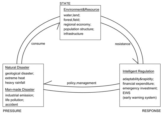 Urban resilience focuses on process characteristics. It emphasizes the ability to maintain sustainable development, stability, and risk monitoring and regulation through internal buffering, self-regulation operation, and self-healing properties after facing various natural or social disturbances, especially when suffering from sudden or more serious disasters. Based on the PSR model proposed by the Organization for Economic Cooperation and Development (OECD) and the United Nations Environment Programme (UNEP) [42], this paper describes the three stages of the cyclic chain relationship of “stress driver—multidimensional system state—intelligent regulation” (Figure 3) to the process attributes of urban resilience development.