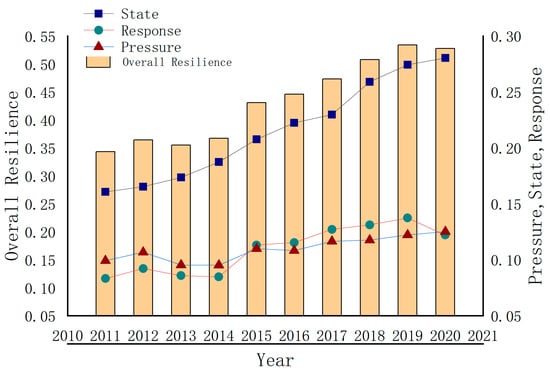 As shown in Figure 4, the trend of overall resilience change in the Hubei section of the Three Gorges Reservoir Area is divided into four stages: the small fluctuation stage from 2011 to 2014, the steep increase stage from 2014 to 2015, the steady increase stage from 2015 to 2019, and the slight decrease stage from 2019 to 2020.