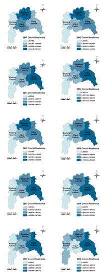 Time series of urban spatial resilience changes in the Hubei section of the Three Gorges Reservoir Area from 2011 to 2020 (self-drawn by author G.C.).