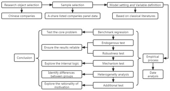 The present research is aimed to examine whether innovation improves the total factor productivity and thus promotes the high-quality development of Chinese enterprises. This study used the panel data of A-share listed companies collected from CSMAR and CNRDS database. Learning from the practice of some classical literature, we set the benchmark model of this study and also selected and defined the corresponding variables. Referring to the research of [], we arranged several empirical tests: first, through the benchmark regression, the core problem of this paper will be tested, that is, what is the impact of innovation on the high-quality development of Chinese enterprises; secondly, a series of endogenous tests and robustness tests will be conducted to ensure the benchmark regression results reliable; then, we will test the mechanism: How innovation affects the high-quality development of Chinese enterprises and explores its internal logic. In addition, this paper tries to relax the general assumption of homogeneity in model setting and selection through a heterogeneity test, so as to have a more reasonable understanding of the results. Finally, through additional tests, it explores whether it is rational for Chinese enterprises to carry out low-quality innovation, and this may prove the necessity and importance of promoting high-quality independent innovation in China from the opposite side. The results obtained from the empirical process were used to draw conclusions. A description of the research design is provided in Figure 1.