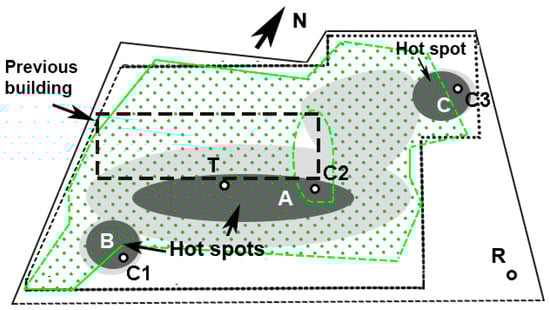 Map of the site. The black dashed line near the centre outlines the building location prior to its removal. The letters A, B and C indicate hotspot areas, where A and B contain high levels of heavy metals, and A and C contain high levels of PAH and PCB. The dark grey colour indicates high contamination, while the light grey colour indicates lower contamination. Sampling points: T, contaminated point; R, non-contaminated reference point; C1, C2 and C3, control points. The black dotted line delimits the area planted with S. viminalis; the green area shows the established S. viminalis plantation.