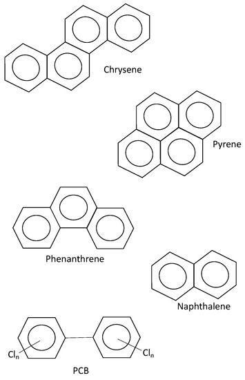 The analysed organic substances also decreased in the soil under S. viminalis cultivation (Table 2). During the 10 years of treatment, PAHs decreased by 20–73%, depending on the substance. It has been shown that PAHs with more rings and more complex ring structures are less able to degrade and be removed from the soil by plants [33]. However, in this work, 47% of a PAH with two aromatic rings—namely, naphthalene—was removed. Even more of phenanthrene—a PAH with a three-ring structure—was removed, at 73%. Regarding PAHs with four rings—namely, chrysene and pyrene—25% and 54% were removed, respectively (Table 2, Figure 2). In comparison with chrysene, pyrene has a more complex structure with more bindings to carbon (Figure 2). Thus, it could be expected that pyrene would be more difficult to degrade and remove than chrysene; however, that was not the case in this study.