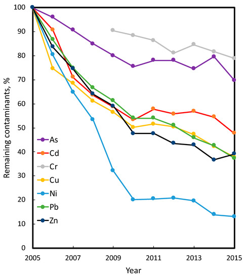 During the 10 years of treatment with S. viminalis, the total concentrations of the various metals and metalloids in the soil decreased by 21–87% (Table 2). The percentage of each contaminant that was removed after 10 years of treatment was as follows: Cr, 21%; As, 30%; Cd, 54%; Zn, 61%; Cu, 62%; Pb, 63%; and Ni, 87%. The lowest decrease was found for As and chromium (Cr). These elements are commonly found in complexes with oxygen; in the available soil fractions, they occurred in the forms of arsenate and chromate anions, which can be taken up by plants. A greater decrease was found for Cd, Zn, Cu and lead (Pb), all of which were removed to a similar extent by the plants. Nickel (Ni) was removed to an even greater extent from the soil by S. viminalis. In the mobile phase, these elements exist in cationic forms, which can be taken up by the plant. Thus, the data indicate that it may be more difficult to remove anions than cations from the soil with S. viminalis.