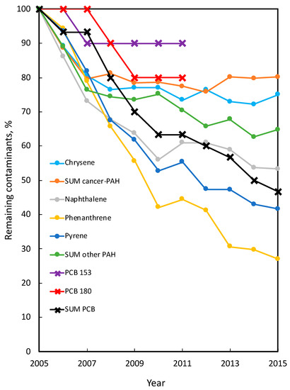 The rate of removal differed among the contaminants. Most of the elements showed a decrease in their removal, with a plateau in the curve after 5 years of treatment with S. viminalis (Figure 3). However, Cr was an exception; even after 10 years, its concentration in the soil seemed to decrease at the same rate. Regarding the organics (Figure 4), no plateau in the curve was observed for the sum of PCBs; however, specific substances such as PCB-153 and PCB-180 did exhibit a plateau after 2 and 4 years, respectively. Among some of the PAHs (i.e., naphthalene, phenanthrene and pyrene; Figure 4), there was a slight decrease in the removal after 5 years of S. viminalis cultivation. The removal of chrysene, the sum of the carcinogenic PAHs and the other PAHs decreased drastically after 2 years. This decrease in the removal after a couple of years may be caused by root growth and by roots interfering with each other during uptake, the bioremediation rate of bacteria decreasing, the contaminant reaching a depletion zone of removal, or biomass growth slowing down due to the depletion of nutrients.