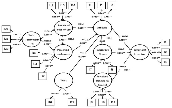 Based on the relative weighting assessment of BI from the three observed variables (I1–3), I3 showed a maximum loading score of 0.894, followed by I1 with 0.890. Of the three observed variables, attitudes toward FDAs (I4–6), I5 and I6 had an equal loading score of 0.761, followed by I4 with 0.740. Of the two subjective norm variants, I7 had the higher loading score of 0.853, whereas I8 had 0.742. Of the three PBC variables (I9–11), I10 had the maximum loading score of 0.922, followed by I9 with 0.890. Of the 3 PEOU variables (I12–14), I12 had the highest loading score of 0.883, followed by I13 with 0.878. Of the 3 perceived usefulness variables (I15–17) I17 had the maximum loading score of 0.896, followed by I15 with 0.871. Of the two trust variables (I18–19), I18 had a score of 0.861, followed by I19 with 0.829. Out of three TTF variables (I20–22), I21 had the maximum loading score of 0.886, followed by I22 with 0.863.