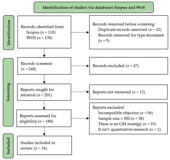 As for the study selection sequence based on the PRISMA Flowchart, it began with the identification phase, which was determined by the characteristics of the research based on the predetermined search equation. The total number of documents found went through a screening process in which duplicates and those that did not correspond to an empirical article were discarded. Then, the actual screening phase was carried out, where documents that could not be retrieved and others determined by the following criteria were discarded: (a) papers whose research objective was not compatible with the purpose of this study, i.e., they were not aimed at presenting a relationship between GM strategies and consumer purchasing behavior; (b) papers with a sample size of fewer than 300 participants, following Malhotra’s proposal, who states that for market studies of a consumer product, a sample range of 300 to 500 respondents should be available [75]; (c) papers that did not present a specific GM strategy; (d) papers with non-quantitative data analysis. Finally, the included phase was completed, where the total number of studies for review was presented.