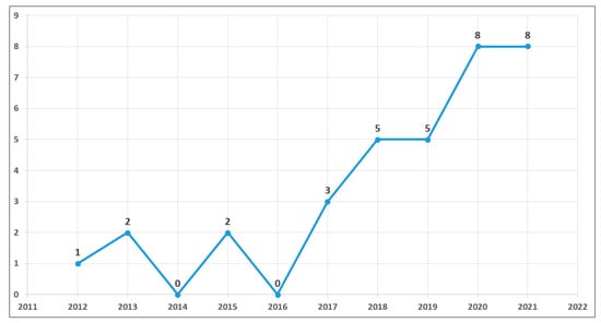 Figure 2 shows the number of publications that have studied the relationship of GM practices with the key variables of consumer purchasing behavior and that, in addition, went through the evaluation process according to the predetermined exclusion criteria. With these characteristics, an average of one article per year was published from 2012 to 2016, following an upward trend from 2017 to 2021, with the years 2020 and 2021 being the ones with the highest productivity at eight research studies published each year.