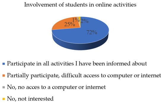 Concerning students’ involvement in online activities, from their answers, it can be concluded that 72% of the respondents participated in all of the activities they were informed about (Figure 3), and 25% partially participated due to difficulty accessing computer or internet services. There is a small percentage of students who did not have access to a computer/internet (1%) or were not interested (2%). Although the percentage of participants in online activities can be considered satisfactory, in some cases, this participation was not an active one. Regarding the degree of participation in online activities, 70% of respondents claimed that they took part in more than 75% of the scheduled activities.